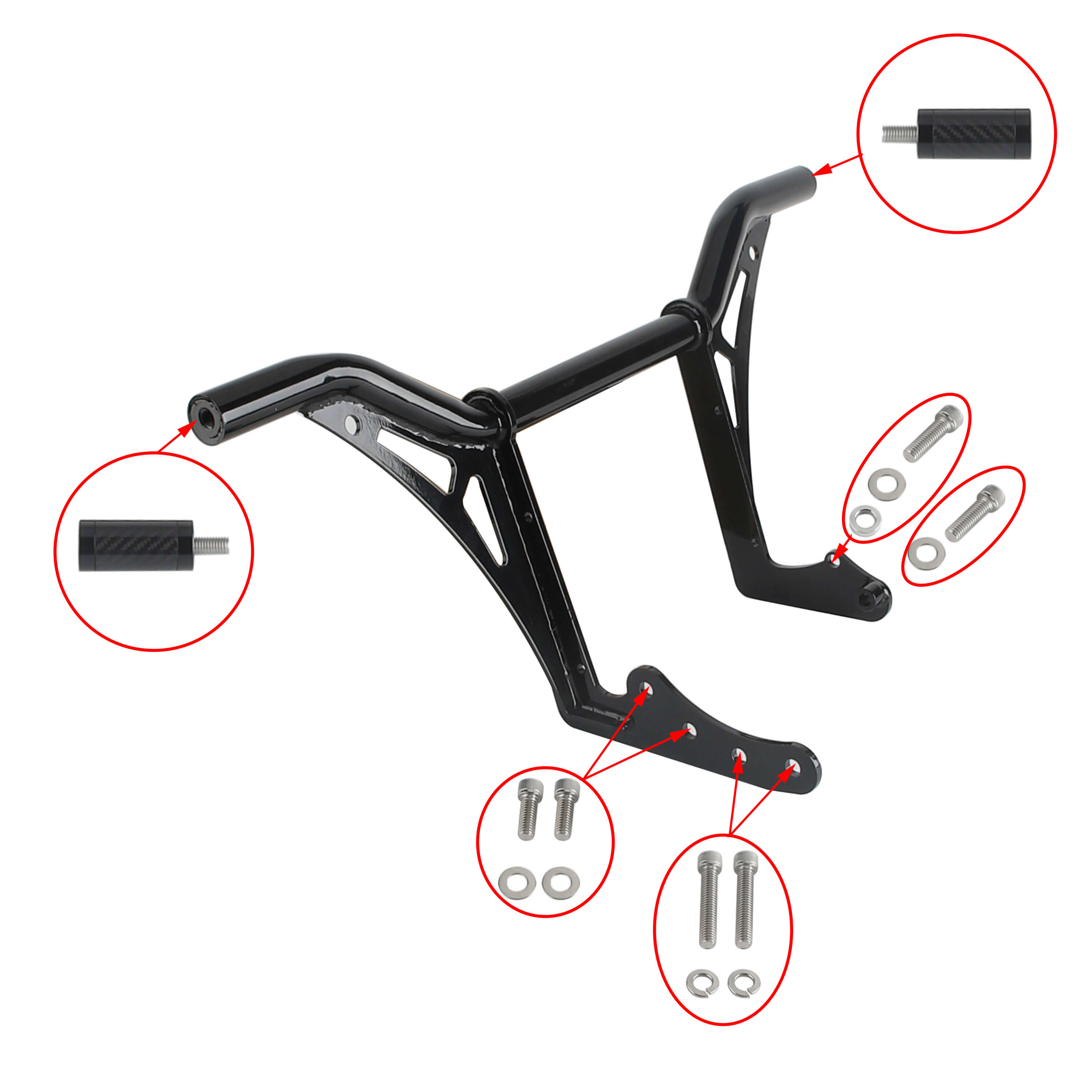 The rear passenger peg crash bar bolts up to the exact location of your stock passenger pegs.